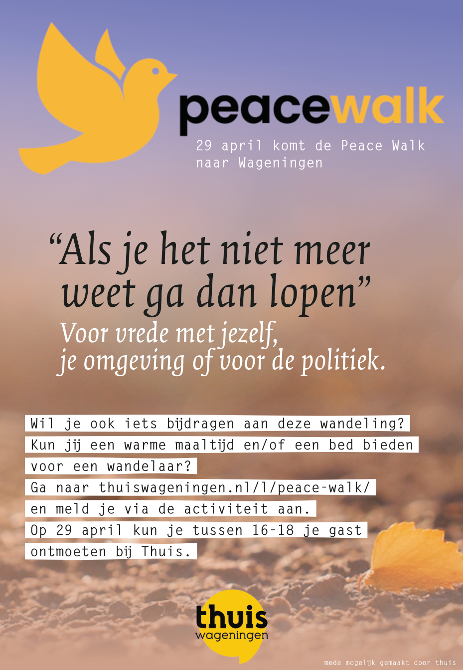 Op woensdag 29 april strijkt een bijzondere groep wandelaars neer in Wageningen. De Peace Walk, een internationale tocht voor vrede en gerechtigheid, bereikt onze stad. Thuis ondersteunt dit initiatief van harte en stelt de Stadskamer open als ontmoetingsplek. We zijn op zoek naar inwoners die de wandelaars een warm welkom willen bieden in de vorm...