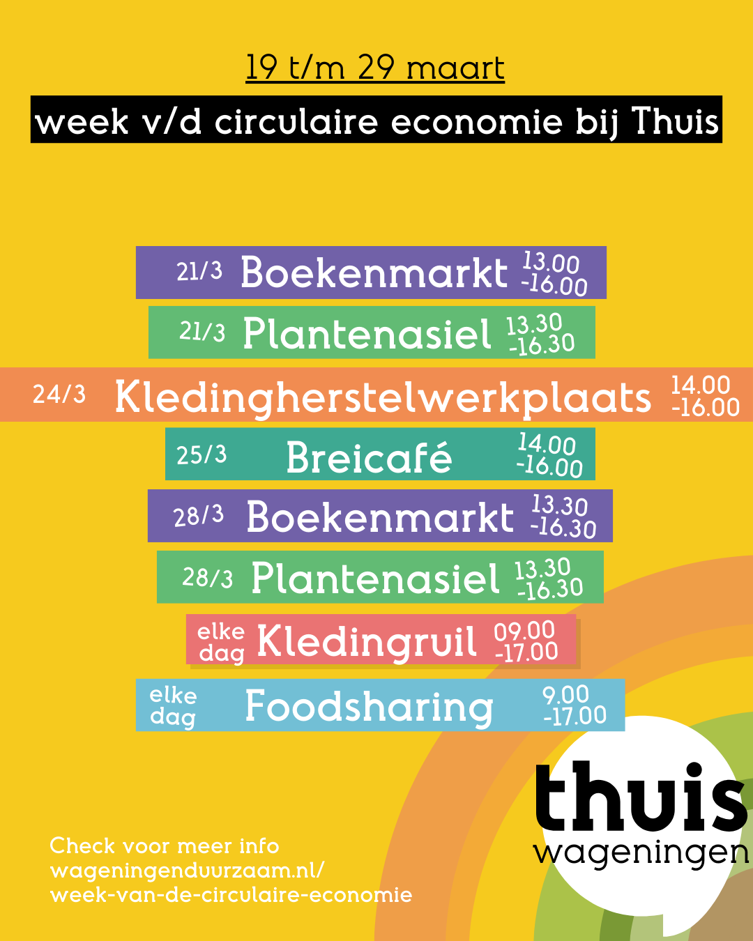 We doen dit natuurlijk niet alleen. Wageningen bruist van de circulaire initiatieven! Terwijl wij ons focussen op de deelkoelkast, kledingruil, boekenkraam en kledingherstel, zijn er in de stad nog veel meer plekken waar de circulaire economie tot leven komt. Denk aan het nieuwe ambachtscentrum van Nu De Toekomst, de reparatie-experts van het Repair Café of de vele kledingmarkten die er deze week zijn. Samen maken we van afval weer een grondstof en van bezit weer delen.